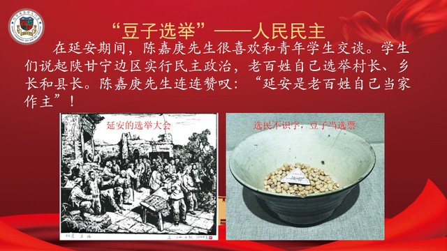 在延安期间,陈嘉庚先生很喜欢和青年学生交谈。一次,学生们说起陕甘宁边区实行民主政治,老百姓自己选举村长、乡长和县长,陈嘉庚先生提出疑问:“老百姓不识字的多,不会写字,怎么选举呢?”学生们告诉他:“开选举大会时,所有候选人都背对选民,每个人身后放一个空碗,豆子当选票,选民信任谁,就把豆子放到谁身后的碗里。最后,数一数,谁碗里的豆子多谁就当选了。这就叫无记名投票,豆子选举。”陈嘉庚先生听后,不禁哈哈大笑,连连夸赞说:“‘豆子选举’好,‘豆子选举’好哇,这才是老百姓当家作主嘛”!正是这一粒粒普普通通的豆子,让陈嘉庚先生明白:陕甘宁是人民的政府,共产党是人民的政党,毛主席,是人民的救星!