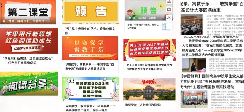 敬贤学堂设立拍摄、制图、文稿编辑排版三大类岗位,对日常内容、重大节日、学堂活动进行采写、编辑排版以及推送。敬贤学堂创立至今在微信公众号——TKKC红色国商共发布推文240余篇,总浏览量达1W +,截至目前关注量达650+。厦门大学嘉庚学院国际商务学院敬贤学堂抖音公众号发布9条视频,收获点赞1K+,总浏览量达7W +。此外,敬贤学堂在国家级/省级权威媒体(如中国共青团、光明日报、中国新闻网、中国青年网、闽南日报等)、网络媒体(如搜狐)微博(如中国大学生在线、福建校园等)以及校院两级官方网站、抖音、微信公众号等平台宣传,总宣传新闻稿件达140余篇、推文达380余篇。其中暑期社会实践的实践成果总宣传篇数达56篇,浏览量达18w+。使敬贤学堂志愿服务内容看得见、摸得着、有形式、有内容、有效果。