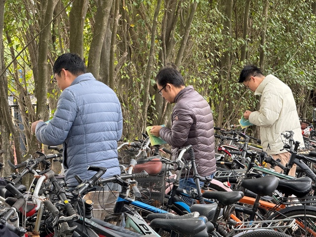 为确保整治工作高效有序推进,支部党员主动担当,带领学生志愿者深入南区田径场、至善广场等无主自行车集中区域,开展拉网式排查与梳理,对排查出的残缺不全、长期闲置的无主自行车逐一粘贴认领提示,明确认领期限与相关要求。认领期满后,将组织校园内未被认领的废旧自行车集中转移至凌云1空地存放,存放期设定为2个月。对于存放期满仍无人认领且部件状况良好的自行车,将统一开展修理、拼装、刷漆等改造工作,打造小绿共享自行车,供师生在校内免费使用,实现资源循环利用。